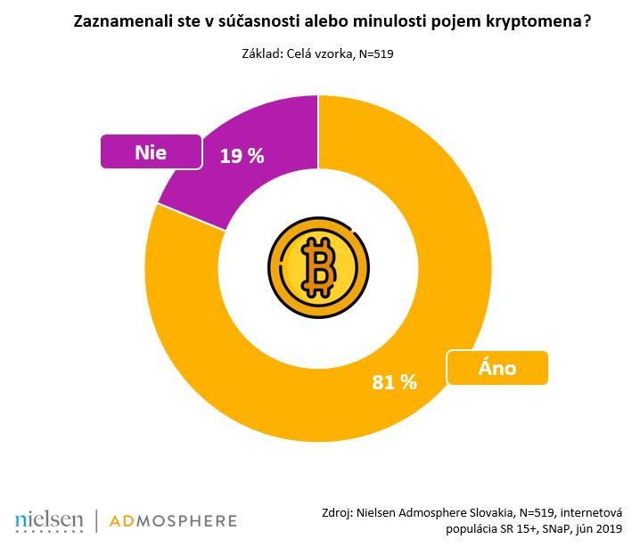 Z tohtoročného výskumu spoločnosti Nielsen Admosphere Slovakia, ktorý nadväzuje na rovnaký výskum realizovaný minulý rok, vyplýva, že štyri pätiny Slovákov vedia, čo sú to kryptomeny a tretina sa o ne aj aktívne zaujíma. Väčšina s nimi avšak doposiaľ neobchodovala. Výskum sa uskutočnil na vzorke päťsto respondentov starších ako 15 rokov z aktivnej internetovej populácie Slovenského národného panela.